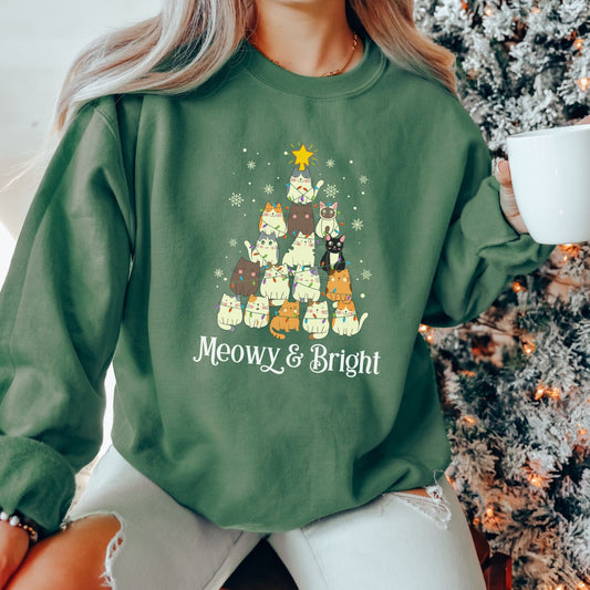 Meowy & Bright Christmas Sweatshirt, Cat Christmas Tree Pullover, Meowy Christmas Crewneck, Cat Mom Christmas Gift, Christmas Plus Size Gift